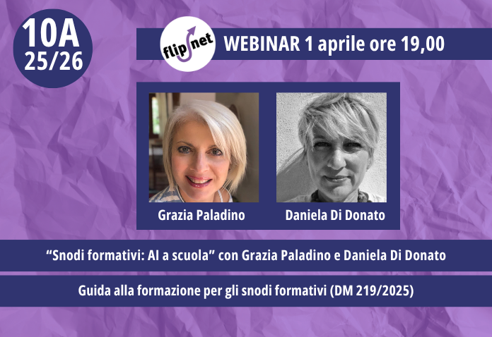 Nel webinar Grazia Paladino e Daniela Di Donato, formatrici Flipnet, vi racconteranno come collaborare per progettare la formazione sull’integrazione delle AI a scuola.